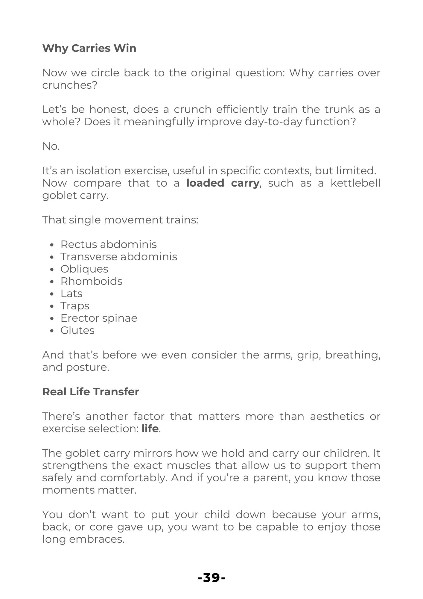 As outlined throughout the book, from the foundations of farmer’s carries to unilateral rack work, sandbag carries and so many more. Loaded carries train more of the body simultaneously than almost any other movement pattern.
